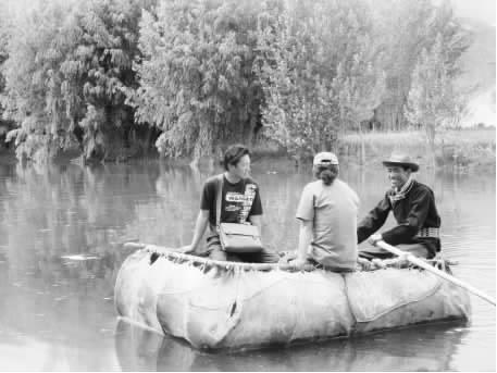 據(jù)當(dāng)?shù)厝私榻B,牛皮船構(gòu)造簡(jiǎn)單,用木頭做船架、牛皮做船體。首先采用比較堅(jiān)硬有彈性的樹木來做骨架,然后把牦牛皮泡在水里,將皮上的毛和肉全部去掉后,用四張牛皮并對(duì)縫起來,趁牛皮軟時(shí)包在骨架上,同時(shí)用牛皮繩子捆緊繃好、曬干、擦油定型,再在牛皮接頭處采用牛、羊油來堵住縫口密封好,避免進(jìn)水。