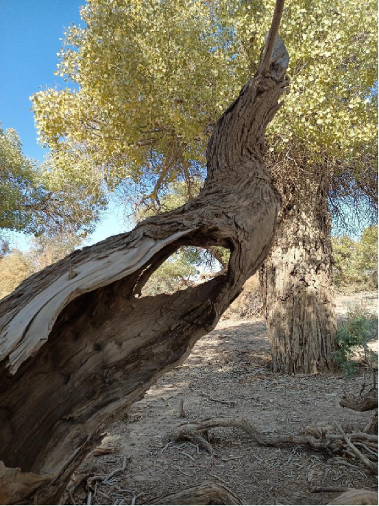 每當(dāng)深秋季節(jié),胡楊樹葉變得一片金黃,形成胡楊秋色,樹影婆娑,奇妙絕倫,賞心悅目。漫步在濃郁的胡楊林中仿佛進(jìn)入神話般的仙境。茂密的胡楊千奇百怪,神態(tài)萬般。粗壯的幾人難以合抱,挺拔的七、八丈之高,怪異的似蒼龍騰越,似虬蟠狂舞,令人驚奇不已,嘆為觀止。僅就密密匝匝的樹葉,也是風(fēng)采獨(dú)有。幼小的胡楊,葉片狹長而細(xì)小,宛若少女嫵媚的柳眉,人們常常把它誤認(rèn)為柳樹;壯齡的胡楊,葉片又變成卵形、闊卵形或三角形,猶如興安嶺的白樺;進(jìn)入老年期的胡楊,葉片才定型為橢圓形。更令人稱奇者,在同一棵胡楊樹冠的上下層次,還長著不同形狀的葉片,因此,又稱“異葉楊”