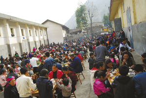 每年秋收后到翌年播種前,是四川涼山金陽縣人結婚的黃金季節(jié)。無論是在縣城還是農村,不管是吃“九斗碗”,還是吃“坨坨肉”,大家都喜歡擺壩壩宴。在金陽縣城,常??梢钥吹竭@樣一幅景象:數(shù)百人聚在一處,圍坐于一張張方桌旁,伸箸暢食,舉杯暢飲。一盆盆肉端上桌子,主人不停地招呼客人趁熱吃。