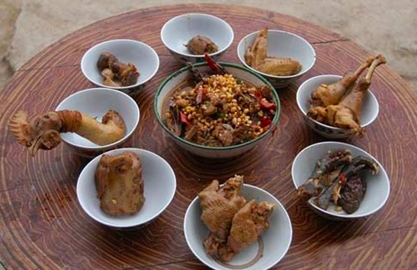“頭”:第一種說法是頭給主人,稱之為“頭不出外”;第二種說法是給客人,表示尊敬;第三種說法是布依族青年男女訂婚時,吃頭的人要把雞腦先剝?nèi)〕鰜斫o大家看,稱之為“吃雞還雞”(因為一個完整的雞腦就活像一只小雞娃),“卦”兩只,原則上是主、客人各一只,稱之為主客平等,表示友好往來。布依族辦紅白喜事或是過年時,都要看“卦”,測算辦的喜事是否吉祥,來年五谷豐登,六畜興旺等,稱之為“吃雞看卦”。看“卦”的內(nèi)容多,道理也比較深奧。其余部位按對象依次分配,它的解釋也較多,吃“雞八塊”時最為講究的有兩點(diǎn):一是須由主人分配,得“頭”的人號召后,方能開席。二是對好“卦”、吉祥“卦”,主人都將其放在自家神堂上。以示四季平安,吉祥如意。
