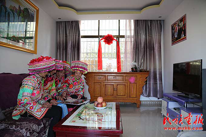 搬到新村后,村民們的生活多了幾分樂(lè)趣。村民張曉倩(右二)拿出自己的結(jié)婚照與姐妹們分享這個(gè)幸福的瞬間