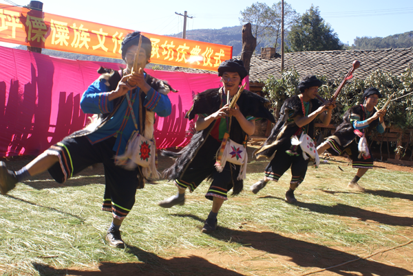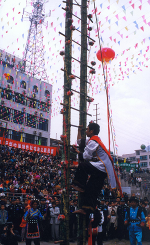 節(jié)日里,婦女們穿著鑲花邊的黑色上衣和點(diǎn)綴著各種銀飾物的花裙,佩戴耳環(huán)、項鏈等首飾,風(fēng)采奪人。男人穿著麻布短衣褲,腰系紅黃長帶,小腿系吊簡,腰佩長刀,肩挎箭包,英姿勃勃。節(jié)目的廣場上,堅趄兩根二十米高的樹干,四周用藤蔓拉緊固定,樹桿上插有三十六把明晃晃的長刀,作為向上攀登的橫檔,刀刃向上,寒光逼人,謂之“刀竿午間。鞭炮齊鳴,鑼鼓震天”。身穿大紅抱、頭纏紅布包頭、赤腳的五名“玩火者”,齊涌至竿下,圍繞刀竿唱歌跳舞,將斟滿的白酒一飲而盡,縱身飛上刀竿。雙手緊提刀面,運(yùn)足氣的腳掌斜置在鋒利的刀刃上,勇敢、靈巧地向上攀登。全場鴉雀無聲,大家屏住呼吸仰面觀看,對他們的氣功絕技贊嘆不已。噼噼啪啪的鞭炮聲來自竿頂優(yōu)勝者,響徹云霄。全場歡呼跳躍,爭相向爬桿者敬獻(xiàn)美酒。對歌、跳舞、蕩秋千活動為節(jié)日增添了濃郁的氣氛。丟煙包(煙盒)活動別具一格,青年男女各站一方,互擲煙包,姑娘將小伙的煙包收藏起來,說明姑娘接受了小伙子的愛慕。