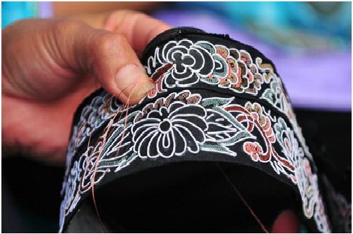 第四步是刺繡,包括三個(gè)環(huán)節(jié),即固定框架圖案、填芯和鑲邊。固定框架圖案,即用一根大針將馬尾線穿好,再用另一根稍小的針穿上同色絲線,然后一邊用馬尾線在布面上鑲成各種圖案,一邊用穿有絲線的小針將圖案固定在布面上。填芯,即用各色絲線將固定好的圖案空隙部分填滿(mǎn)。鑲邊,即用橙色和黑綠色絲線在四周挑繡成鑲邊圖案。
