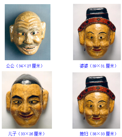 面具,土族語稱“面古子”,是土族在表演某些儀式舞蹈時(shí)用以表現(xiàn)一定內(nèi)涵的道具。按形制可分為假面和假頭兩大類。其中最具代表性的當(dāng)屬“納頓”節(jié)日當(dāng)中使用的面具。民族文化宮博物館珍藏了三組土族“納頓”面具,分別為表演“莊稼其”時(shí)的公公、婆婆、兒子、媳婦的假面面具;表演“殺虎將”時(shí)的殺虎將、虎、猴、牛的假面、假頭面具;表演三國演義人物關(guān)羽、張飛、曹操、呂布的假面面具。面具材質(zhì)均為布胎, 20世紀(jì)80年代征集于青海省海東市民和回族土族自治縣。