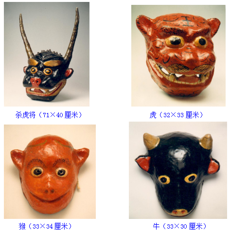 “殺虎將”反映的是當(dāng)?shù)匾暈樯酵鯛數(shù)臍⒒槊癯Γ捣匣⒌膬?nèi)容。面具角色有牛、虎、猴、殺虎將。牛象征農(nóng)民,代表善,虎和猴象征禍害。表演牛和虎、猴激烈打斗,當(dāng)牛被打敗倒地時(shí),殺虎將持劍上場(chǎng),打殺格斗等場(chǎng)面。此時(shí)場(chǎng)外觀眾上場(chǎng)助戰(zhàn),直至將虎降服,整個(gè)場(chǎng)面熱烈緊張。