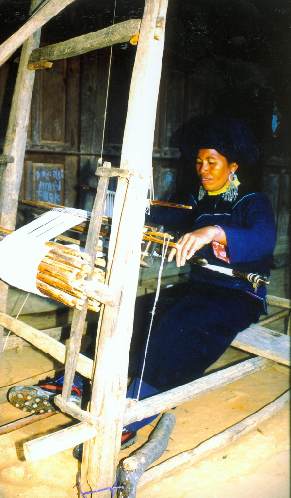 ?。?)染色。布朗族的印染技術(shù)比較單一,所使用的染色原料是自家栽種的藍(lán)靛和各種野生植物。根據(jù)所需顏色采用不同的植物,如染藍(lán)色取自藍(lán)靛,染黃色取自黃花汁。制作靛墨的程序是用水把藍(lán)靛的葉、莖泡化,撈去渣滓待其沉淀。染布時(shí),再配上一種樹(shù)皮,一起置于鐵鍋熬成藍(lán)汁,然后將白線或白布放入鍋中,反復(fù)熬煮幾次即成藍(lán)線或藍(lán)布。