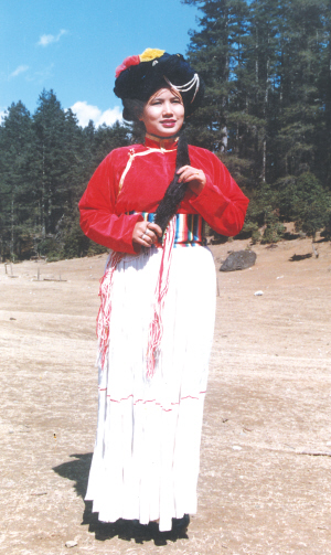 寧蒗地區(qū)的普米婦女多穿束腰、多褶的百褶裙,常用白藍(lán)等色的棉麻布制成,裙長(zhǎng)幾乎拖至腳面?;顒?dòng)時(shí),她們將裙子從左面提起,掖在腰間。