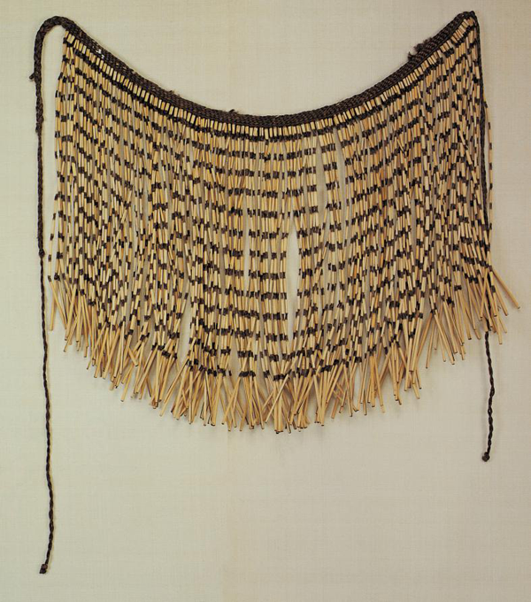 博嘎爾婦女穿一種叫“基都”的短上衣。用野麻織成的土布縫制,其樣式為無領、短袖、對襟。下部穿用羊毛織成的粗呢緊身筒裙,稱作“結邦”。小腿部扎裹腿,叫“涅蘇木”。條件好的人家外面還會罩一件稱為“階納布”的披肩。希蒙部落的婦女穿當?shù)孛藁棾傻陌咨蛩{色的寬大對襟短上衣。下身穿筒裙,裙子下擺較寬,上面織有黃紅色或黃黑色的簡單圖案(圖為民國時期的珞巴族草裙,中央民族大學民族博物館館藏)。