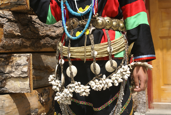 珞巴族男女都喜歡佩帶裝飾品,男子戴手鐲、竹管耳環(huán)、項鏈,腰間掛弓箭、長刀等物。婦女特別喜歡佩戴五顏六色的項珠,盛裝的婦女脖頸上有時戴十幾串到幾十串珠子,再加上手鐲、耳環(huán)、銅鈴、銀幣、鐵鏈、小刀、火鐮、海貝等飾物,有十幾斤重,可裝滿一個竹背筐,并被視為家庭財富多寡的標志,不可缺少的嫁妝。