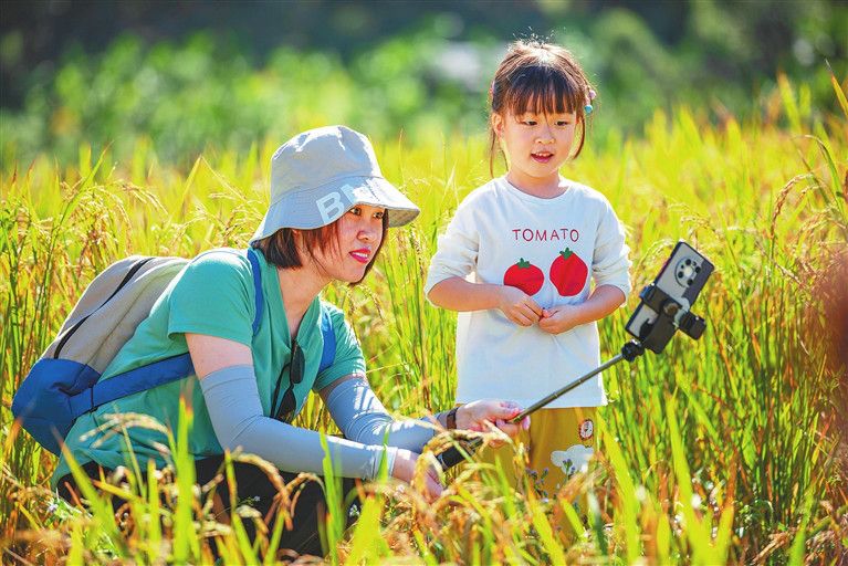 游客在山蘭稻田拍照留念。李天平 攝