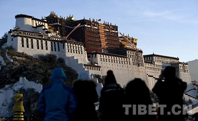 圖為2月5日,游客在藥王山觀景臺(tái),迎接新年第一天第一縷陽光灑向布達(dá)拉宮。
