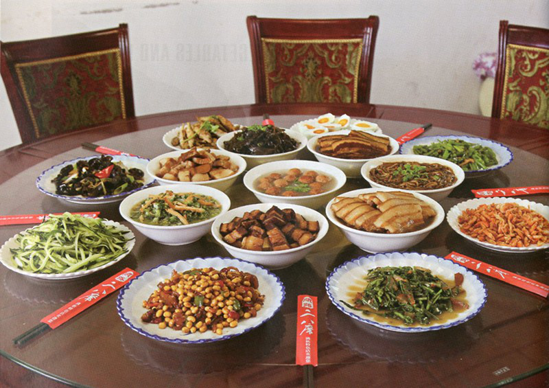 關于二八席的由來,在七道梁村是這樣流傳的:當年,薩爾滸大捷后,努爾哈赤要求八旗各拿出一盤和一碗本旗最好的吃食,以供設宴擺席之用。于是,八旗紛紛響應,八個盤、八個碗的特色菜肴湊在一起,便有了二八席。