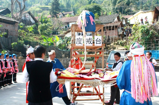 “度戒”臺(tái)(俗稱“巫臺(tái)”,亦稱“神臺(tái)”或“五臺(tái)山”)設(shè)在村子下面的一塊小地里,因這次有兩人“度戒”,便并列設(shè)了兩個(gè)“巫臺(tái)”。“巫臺(tái)”搭得較簡(jiǎn)單,先在場(chǎng)地上打4棵木樁,用四方桌作臺(tái)頂,桌子的4腳分別捆在木樁上,臺(tái)高約4米;“巫臺(tái)”前搭有一架有5個(gè)臺(tái)階的木梯,等“度戒”者送上臺(tái)后便把木梯砍掉;臺(tái)后有一張用大青藤編成的狀如蛛網(wǎng)的大網(wǎng),上面鋪著幾床新被子,約有10人對(duì)稱拉開(kāi),等“度戒”師下令,“度戒”者從“巫臺(tái)”上仰面滾落下來(lái)。拉網(wǎng)的人乘“度戒”者墜落進(jìn)網(wǎng)之勢(shì),把他輕放于地上,并將手中之繩速向?qū)Ψ綊仈n,“度戒”師看了其落地的姿勢(shì)可以,此次“度戒”便算成功了。