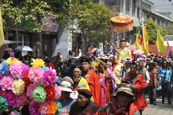 農(nóng)歷二月初六,迎太子入城。這一天在佛教徒的帶領(lǐng)下,人們焚香沐浴,衣冠整齊,虔誠地將“太子”(用布扎油漆制成的太子行像)請(qǐng)到行宮或本主廟里。這一年的新郎為太子抬轎,希望能得到太子的保佑而使新婚的妻子孕生男兒。