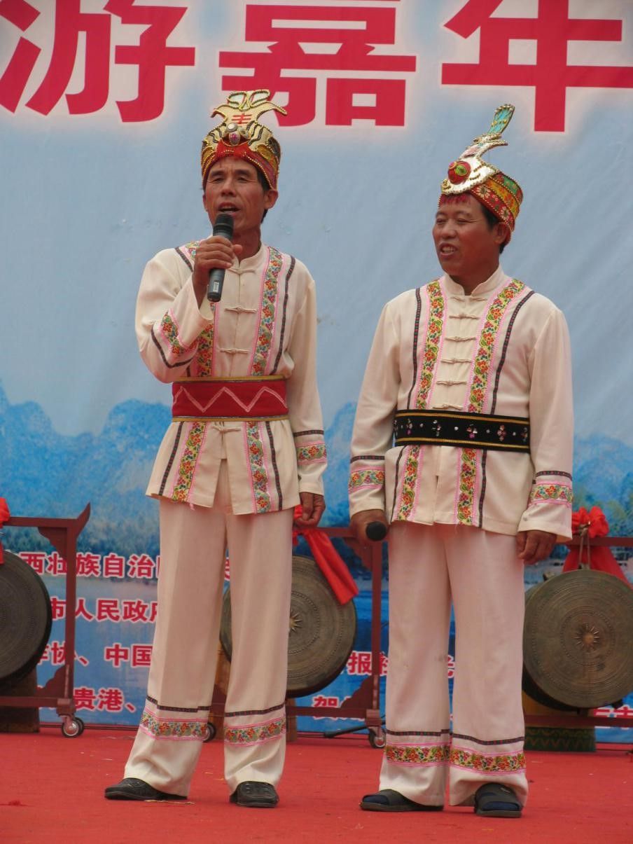壯族傳統(tǒng)音樂(lè)主要是各種山歌曲調(diào),是產(chǎn)生于古代的詩(shī)歌、音樂(lè)、舞蹈三位一體的古老聲樂(lè)藝術(shù)。在壯族地區(qū),幾乎每個(gè)鄉(xiāng)都有幾個(gè)固定的曲調(diào),有用于敘事的平調(diào)、抒發(fā)歡快心情的喜調(diào)、平緩柔和細(xì)膩深沉的詩(shī)調(diào),富于教誨性的卜牙(老人)調(diào)和表現(xiàn)哀傷悲調(diào)等。曲式有支聲式、和聲式和復(fù)調(diào)式,用于獨(dú)唱、領(lǐng)唱、重唱、合唱的民歌調(diào)有相應(yīng)的曲式結(jié)構(gòu)。其中合唱又分為二聲部和三聲部。曲藝有末倫、唱師、比余等,唱師的唱本脫胎于經(jīng)詩(shī),一般為七言句式,以一鼓一鑼過(guò)門,無(wú)伴奏。曲牌各地不一,每個(gè)地方一般由AB調(diào),比較固定。末倫流傳于桂西南地區(qū),來(lái)源于巫調(diào),發(fā)展成為曲藝。其詞為七言或五言,上下句式,以三弦伴奏,藝人自彈自唱,詞很優(yōu)美。內(nèi)容有說(shuō)故事、訴苦情、嘆離別等,可長(zhǎng)可短,形式靈活。比余流傳于紅水河中游東蘭、鳳山一帶,詞為長(zhǎng)短句,腰腳韻,寓言式或隱喻式,生動(dòng)活潑。演唱時(shí),藝人與聽(tīng)眾互相呼應(yīng),氣氛熱烈。