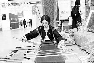 2021年5月,在第六屆全國大學(xué)生藝術(shù)展演活動(dòng)現(xiàn)場,海南師范大學(xué)學(xué)生展示黎族腰織機(jī)織錦技藝。第六屆全國大學(xué)生藝術(shù)展演活動(dòng)組委會(huì)供圖