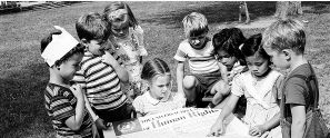 1950年,聯(lián)合國國際育童學(xué)校的孩子們?cè)陂喿x第一張《世界人權(quán)宣言》的海報(bào)。