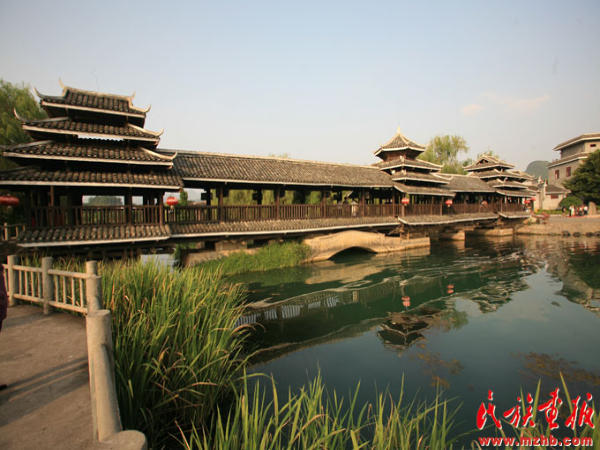 詩人郭沫若先生雖然沒有到過柳州的三江侗鄉(xiāng),但看完一幅程陽橋的圖片后,竟也引發(fā)了如潮的詩思,欣然寫下了一首七律:“艷說林溪風(fēng)雨橋,橋長廿丈四尋高。重瓴聯(lián)閣怡神巧,列砥橫流入望遙。竹木一身堅勝鐵,茶林萬載茁新苗。何時得上三江道,學(xué)把犁鋤事體勞。”