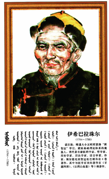 伊希巴拉珠爾(1704~1788),蒙古族,一名也協(xié)班覺(jué)、額爾德尼班智達(dá)·松巴堪布,蒙古衛(wèi)拉特人,著名蒙醫(yī)學(xué)家、文學(xué)家、天文學(xué)家哲學(xué)家。一生著作豐厚,其中對(duì)完善蒙醫(yī)理論體系有重要影響的著作有《甘露之泉》、《白露醫(yī)法從新》、《甘露點(diǎn)滴》、《甘露匯集》和《認(rèn)藥水晶鑒》,在這些著作中他將藏醫(yī)學(xué)理論與蒙古人的體質(zhì)、生活習(xí)俗、居住地區(qū)的地理、氣候條件等具體實(shí)際結(jié)合在一起,進(jìn)行創(chuàng)造性的理論研究,不僅豐富了臨床實(shí)踐的內(nèi)容,而且補(bǔ)充和完善了蒙醫(yī)學(xué)的理論體系,他將傳統(tǒng)蒙醫(yī)學(xué)“寒熱理論”與《四部醫(yī)典》中關(guān)于寒熱病理論的闡述進(jìn)行有機(jī)結(jié)合,使之成為近代蒙醫(yī)學(xué)病性辯證的總綱,同時(shí),他也闡述了將六基癥作為病因鑒別診斷的核心及其臨床表現(xiàn),使“六基癥”學(xué)說(shuō)從理論到實(shí)踐都獲得了比較系統(tǒng)的發(fā)展。占布拉道爾吉是19世紀(jì)著名的蒙藥學(xué)家,他編著的《蒙藥正典》(又名嗚嗚蒙藥圖鑒)共收載蒙醫(yī)臨床常用藥物879種,按礦物、植物和動(dòng)物等分為8部24類(lèi),附插圖576幅,對(duì)每種藥物的產(chǎn)地、形態(tài)、性味、功能、入藥部分、采集加工、炮制方法、主治、用法等都闡述詳盡,并且每一味藥物都標(biāo)寫(xiě)了蒙、藏、滿、漢四種文字的藥名,具有很高的參考價(jià)值。該書(shū)還附有外科術(shù)療器具圖解,以及放血穴位、針灸穴位、人體各部分劃分圖解說(shuō)明等。敏如爾古布拉(1789-1838)編撰了蒙醫(yī)學(xué)方劑巨著《方海》,是一部比較系統(tǒng)完整的蒙醫(yī)藥物方劑學(xué)經(jīng)典著作,收載方劑近200種,分為76章,進(jìn)行詳盡的論述和評(píng)點(diǎn),同時(shí)對(duì)相關(guān)疾病的病因、病機(jī)、分類(lèi)和治法等也做了簡(jiǎn)要論述。