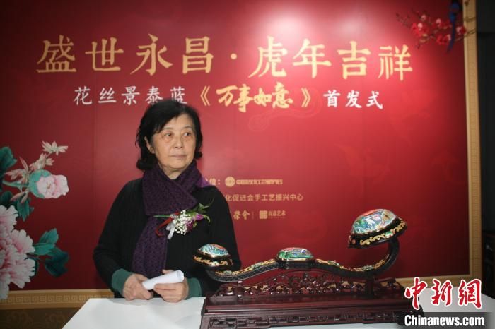 中國工藝美術(shù)大師程淑美介紹花絲景泰藍(lán)賀歲作品《萬事如意》 李妮 攝