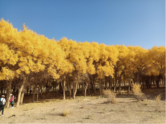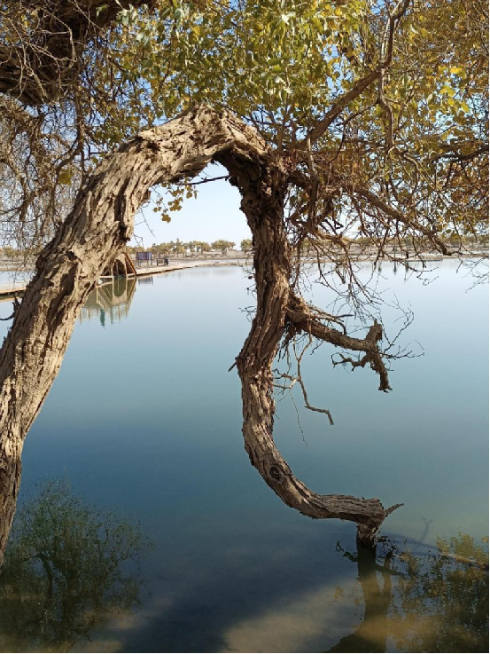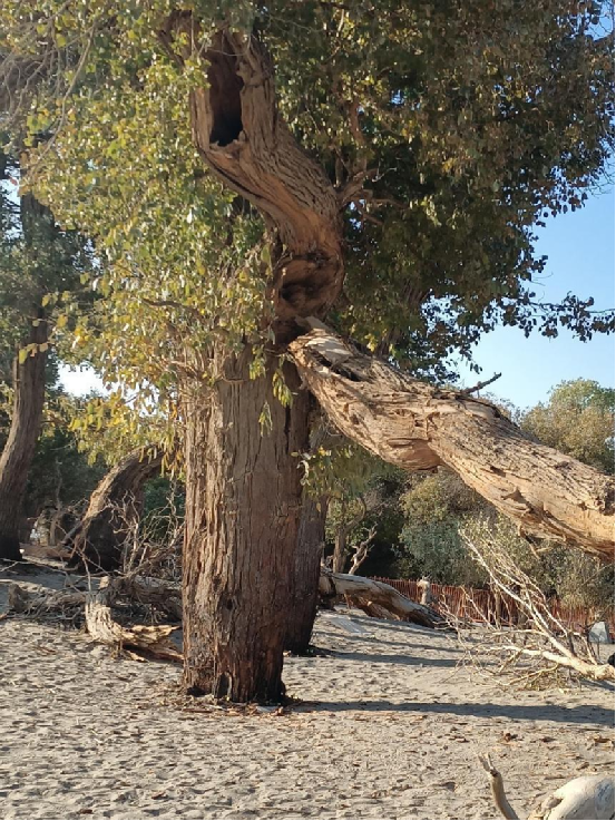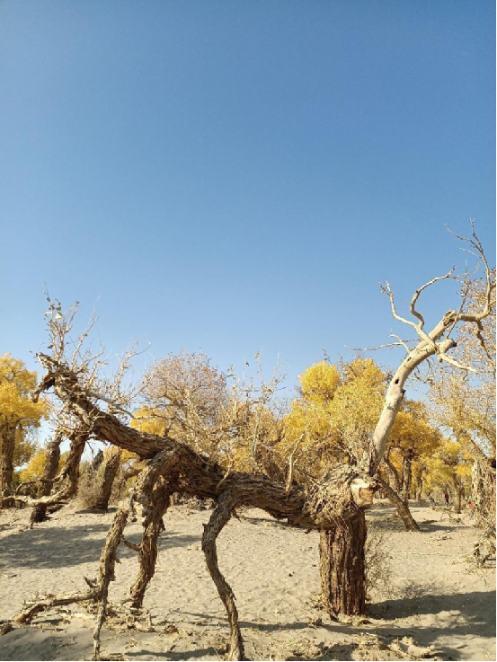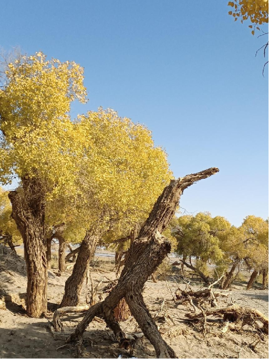 每當(dāng)深秋季節(jié),胡楊樹葉變得一片金黃,形成胡楊秋色,樹影婆娑,奇妙絕倫,賞心悅目。漫步在濃郁的胡楊林中仿佛進(jìn)入神話般的仙境。茂密的胡楊千奇百怪,神態(tài)萬(wàn)般。粗壯的幾人難以合抱,挺拔的七、八丈之高,怪異的似蒼龍騰越,似虬蟠狂舞,令人驚奇不已,嘆為觀止。僅就密密匝匝的樹葉,也是風(fēng)采獨(dú)有。幼小的胡楊,葉片狹長(zhǎng)而細(xì)小,宛若少女嫵媚的柳眉,人們常常把它誤認(rèn)為柳樹;壯齡的胡楊,葉片又變成卵形、闊卵形或三角形,猶如興安嶺的白樺;進(jìn)入老年期的胡楊,葉片才定型為橢圓形。更令人稱奇者,在同一棵胡楊樹冠的上下層次,還長(zhǎng)著不同形狀的葉片,因此,又稱“異葉楊”