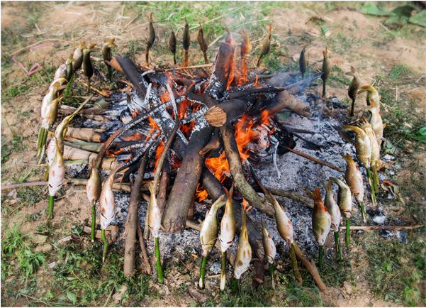 說(shuō)起燒魚(yú),得從古代人類(lèi)祖先燒肉燒魚(yú)談起。苗族先輩們?cè)陂L(zhǎng)期的遷徙跋涉中,或到西南方向的崇山峻嶺定居后,都要到山下水塘、溪流中捕捉蛙魚(yú)來(lái)充饑,維持生活。由于沒(méi)有鍋頭和碗具,只能燃燒篝火紅炭來(lái)燒烤蛙、魚(yú)至熟,然后上山采摘蕉葉、芒草來(lái)墊盛,大家圍攏在一起一同享用,久而久之便形成了野炊燒魚(yú)的習(xí)慣,一直流傳至今。